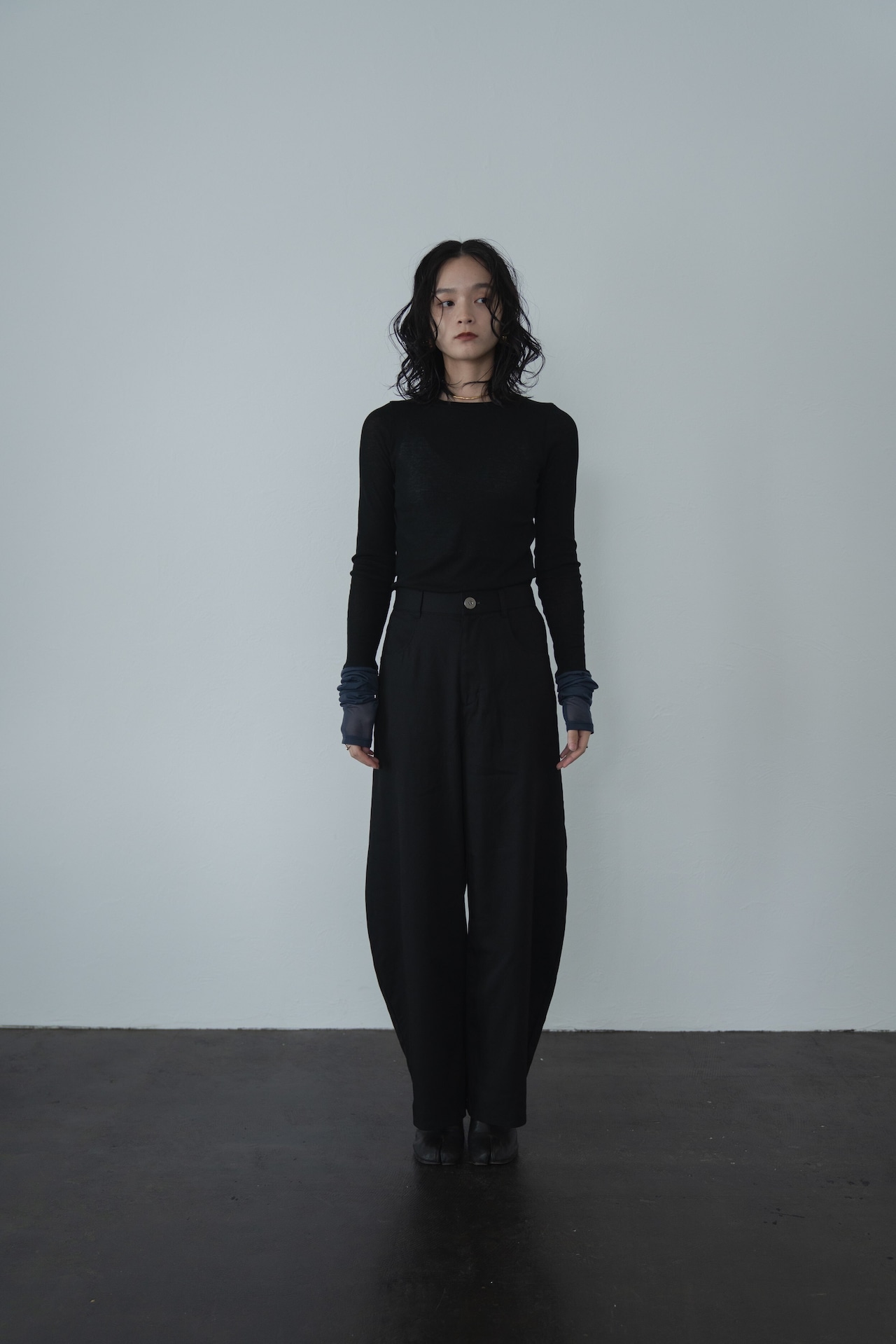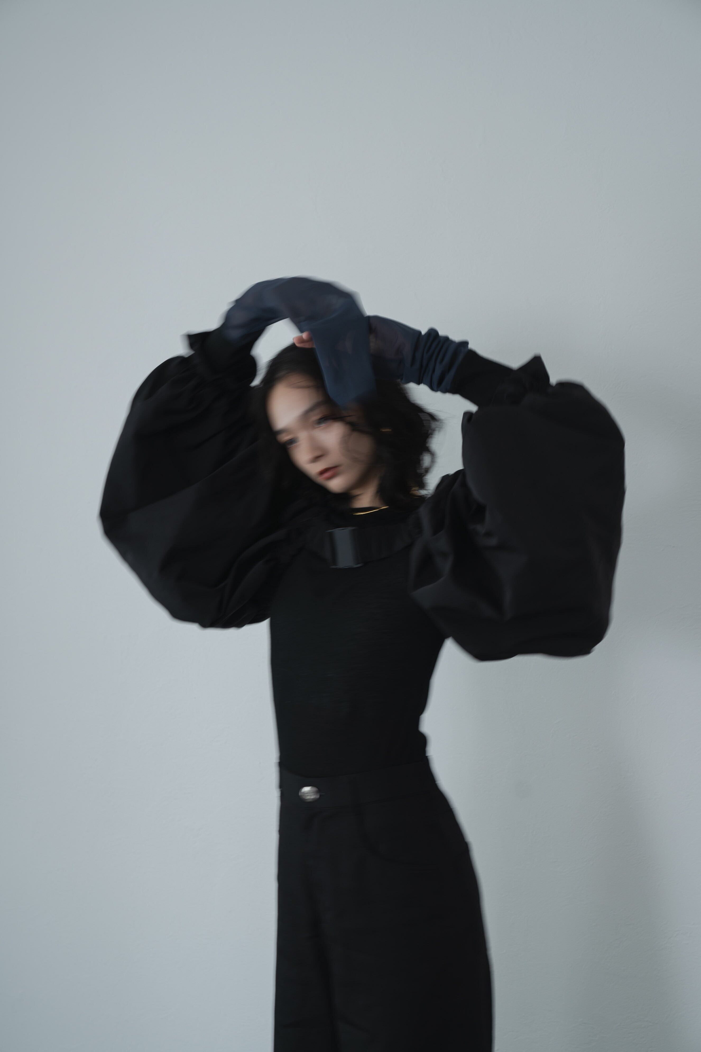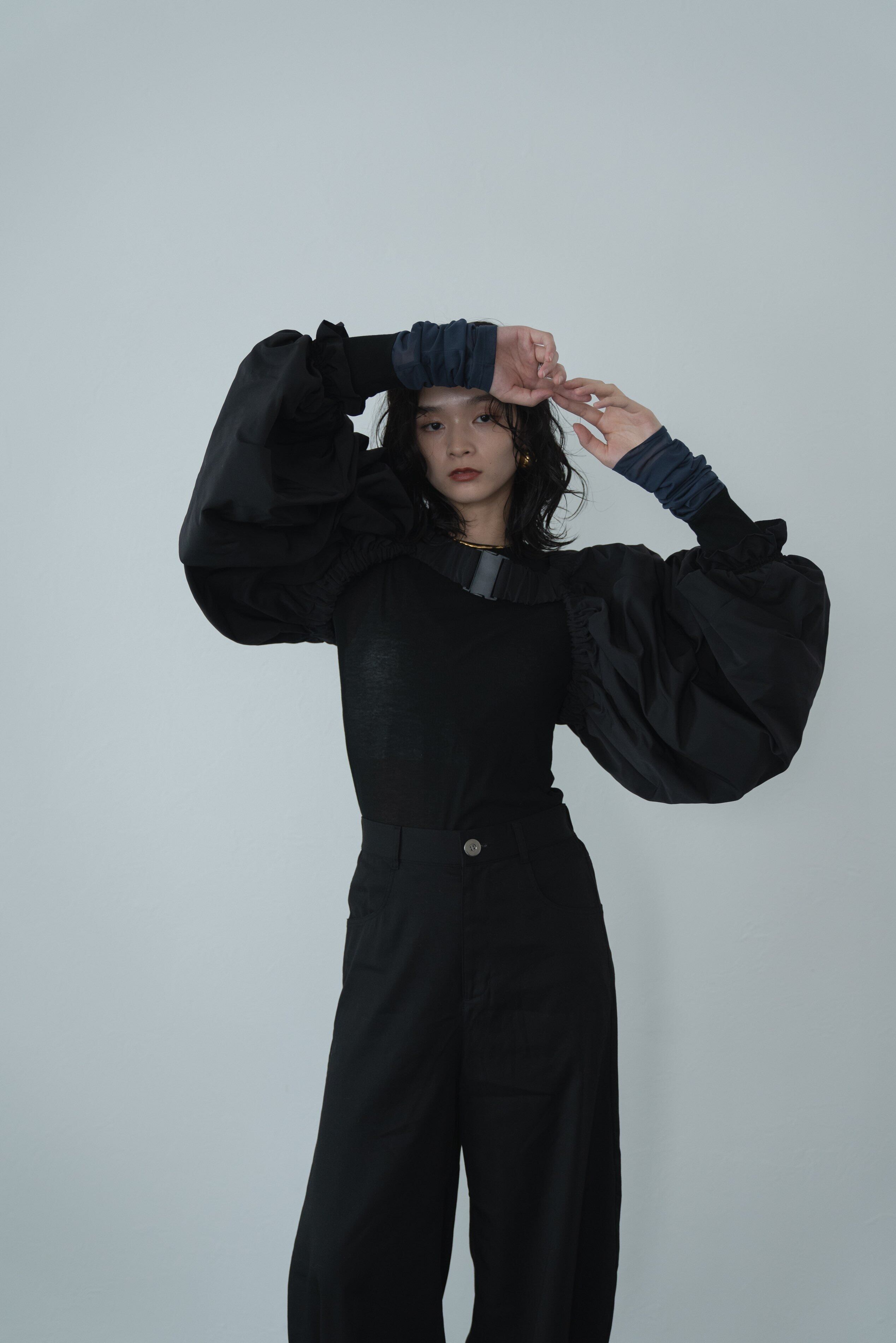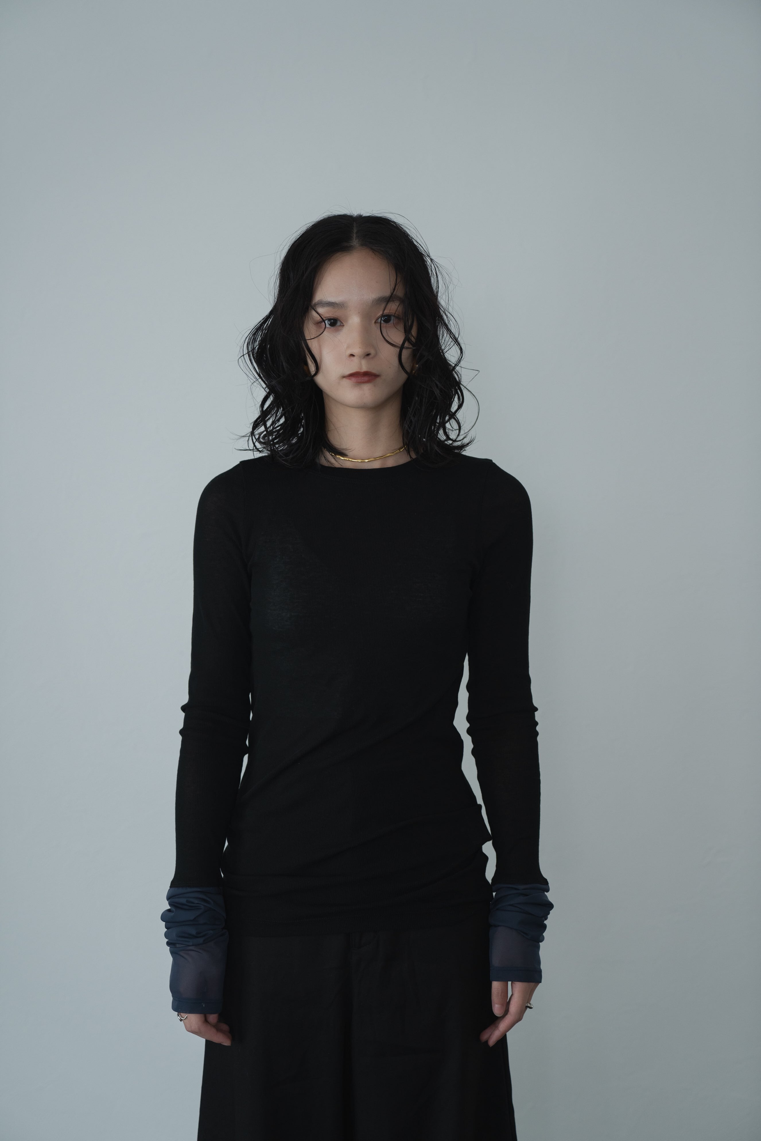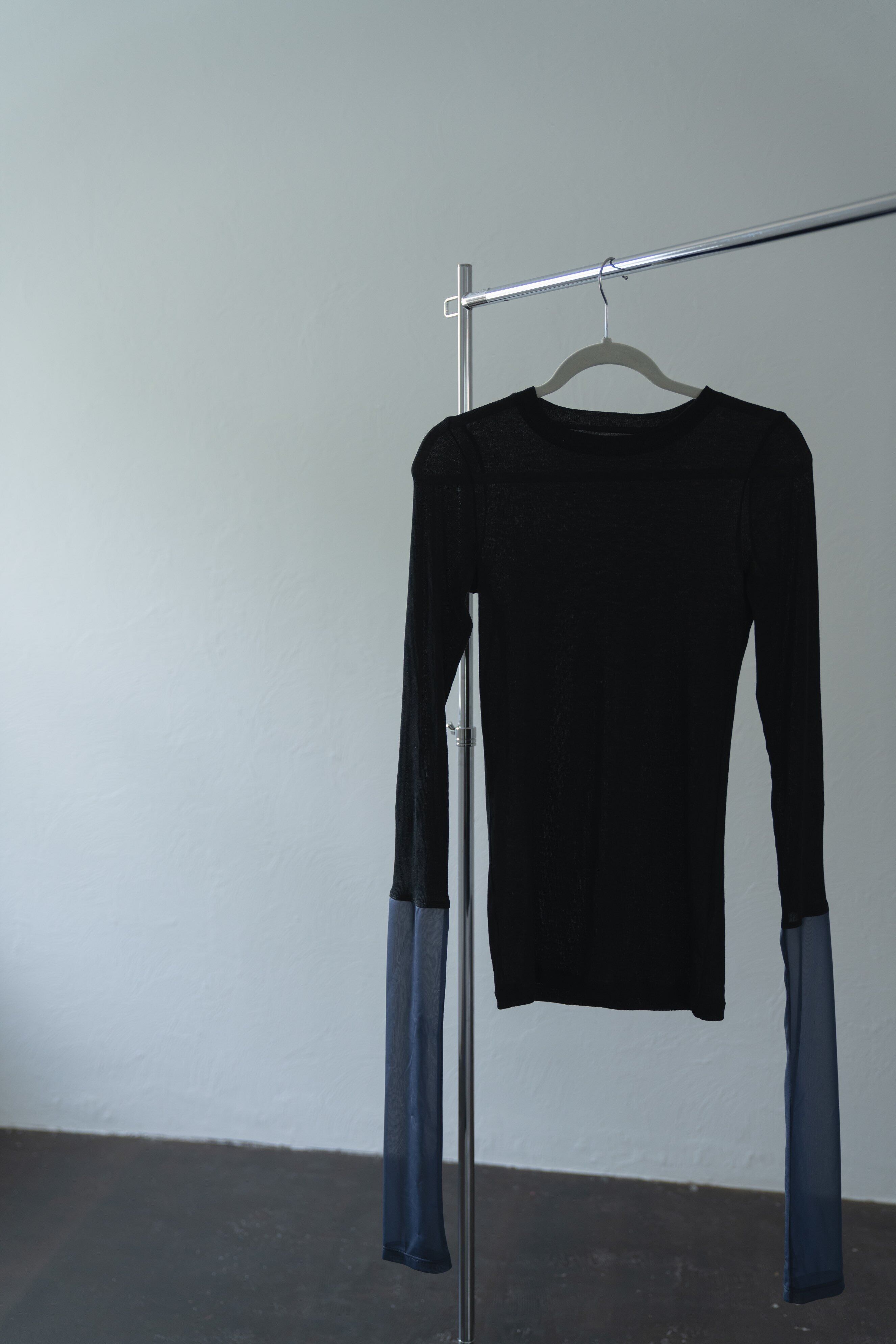 シアー素材の袖と切り替えデザインが目を引くリブロンTシャツ。